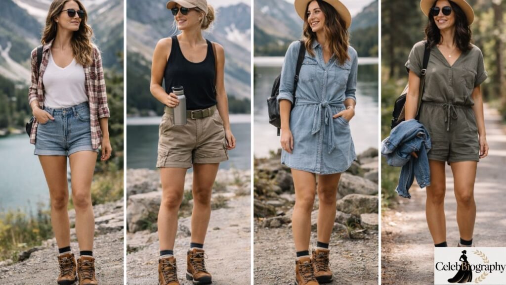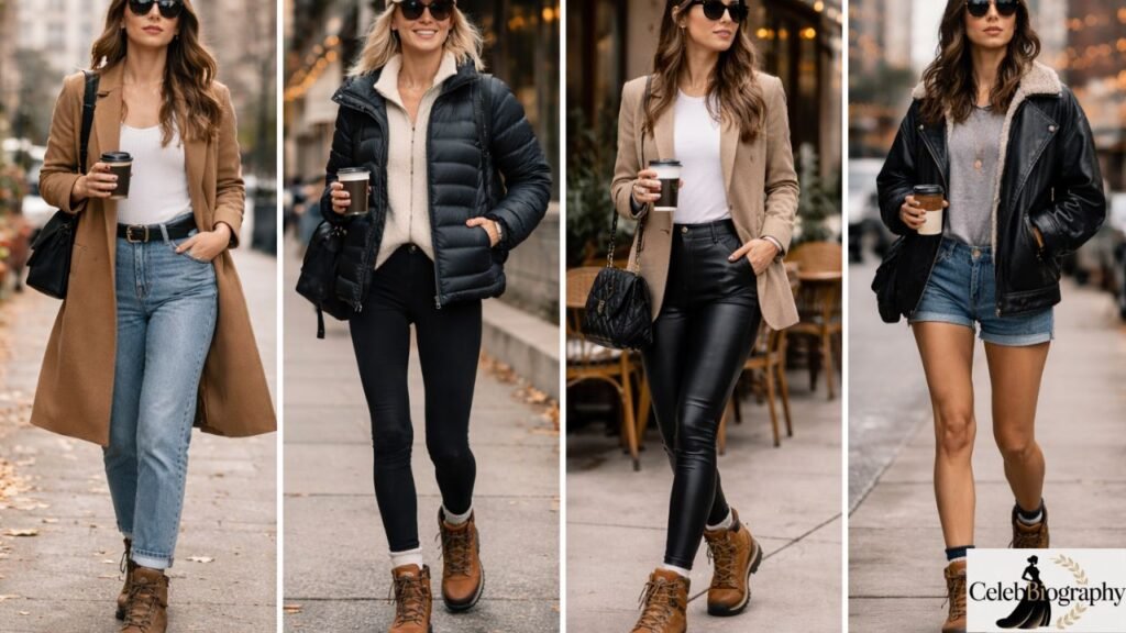 Shorts and hiking boots create a sporty and youthful outfit that feels energetic and bold. This combination is often seen in trendy hiking boots outfits and is popular for outdoor events, festivals, and travel. Denim shorts give a casual look, while biker shorts create a more athletic style. Both options fit well with hiking boots everyday style and allow you to move freely while looking stylish.